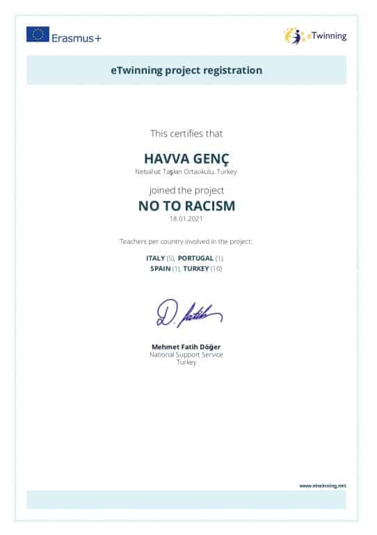 Nebahat Taşkın Ortaokulu olarak " No to Racism" Irkçılığa hayır e twinning projesine dahil olarak öğrencilerimize birlik ve beraberlik içinde yaşamayı ırkçilığa karşı bilinç uyandırmayı hedefliyoruz ve Erasmus+ Ka101 " Çeşitlilikten Uyum Yarat" projemizi desteklemek ve yaygınlaştırmak için çalışıyoruz.